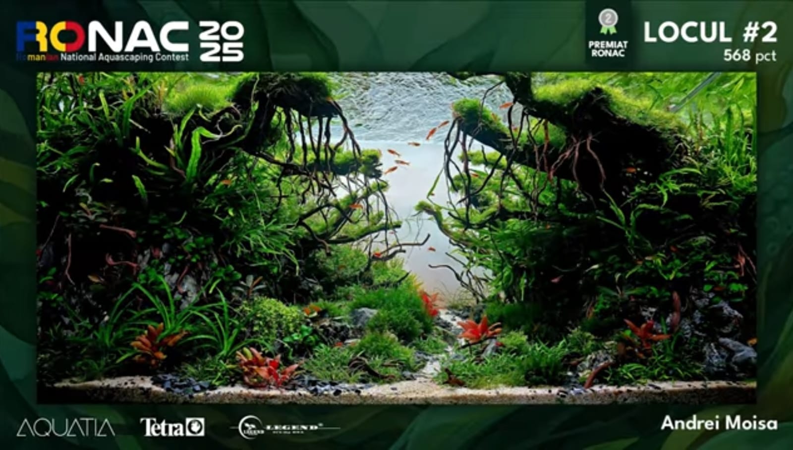 Acest layout a obținut Locul 2 la RONAC 2025, într-o competiție extrem de strânsă, unde Locul 1 a fost ocupat tot de Dream Aquarium Decor, cu proiectul „Tăcerea Pădurii”, o premieră rară și o confirmare a nivelului atins de echipa noastră.