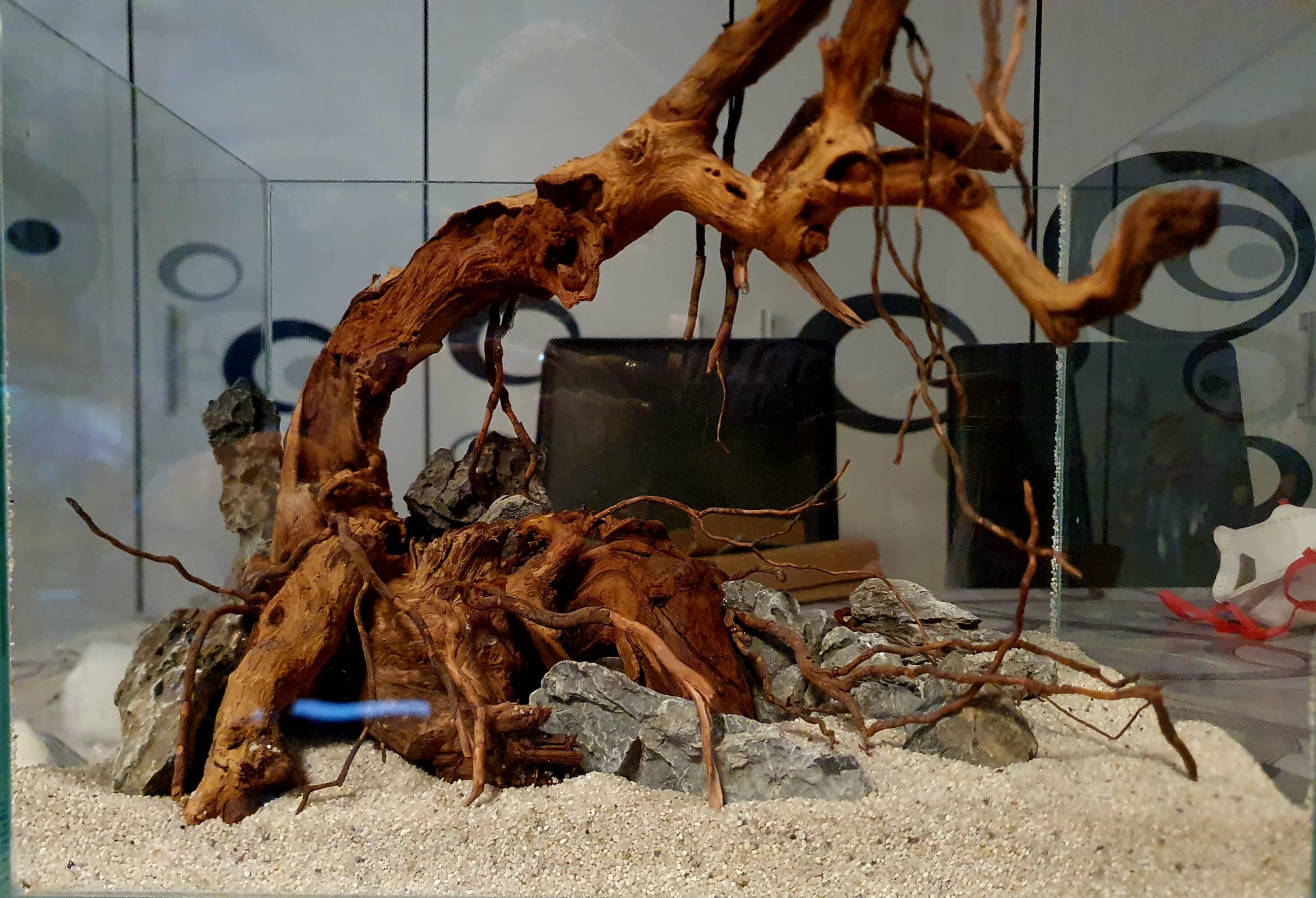 Lemnul curbat adaugă profunzime, plantele atent selecționate se dezvoltă armonios în volumul limitat, iar compoziția naturală creează senzația unui acvariu matur și echilibrat – totul într-un spațiu de doar 10 litri. 🌿