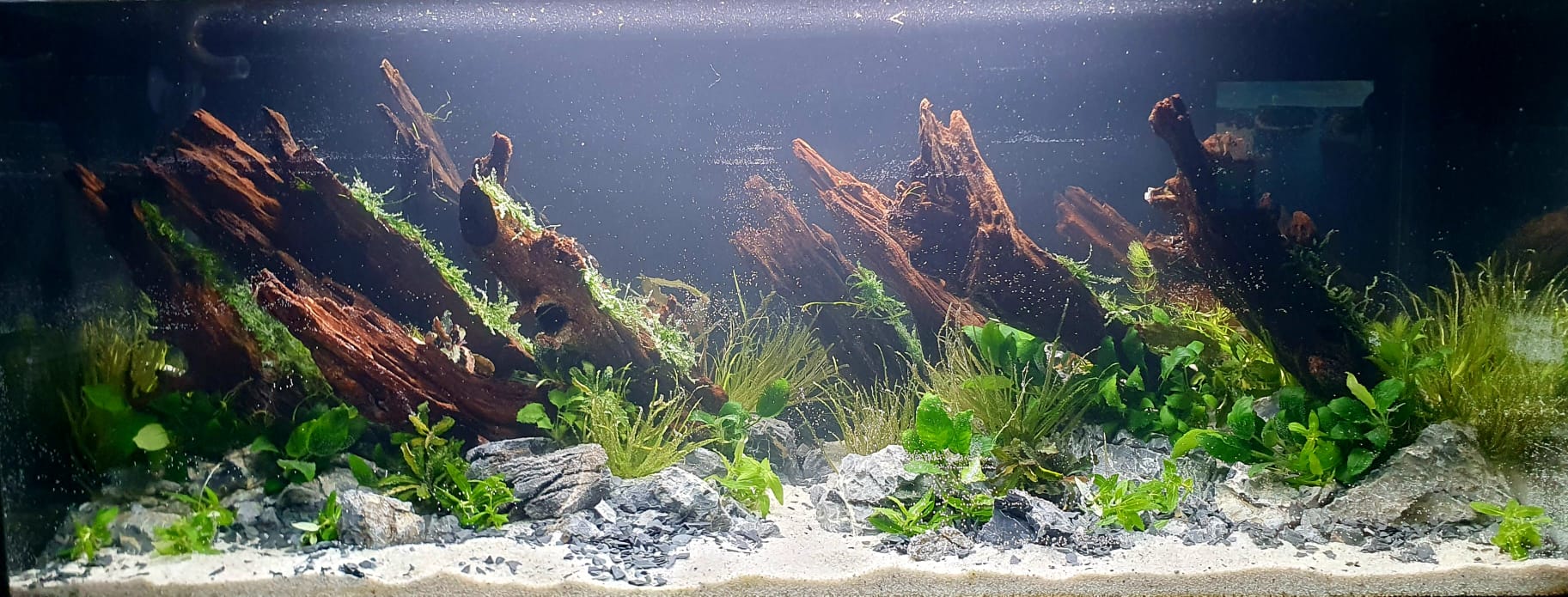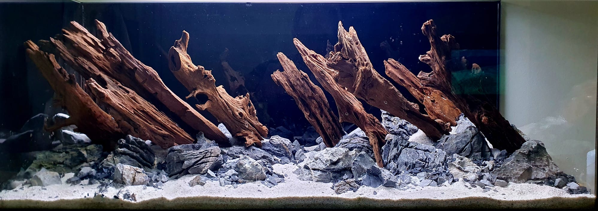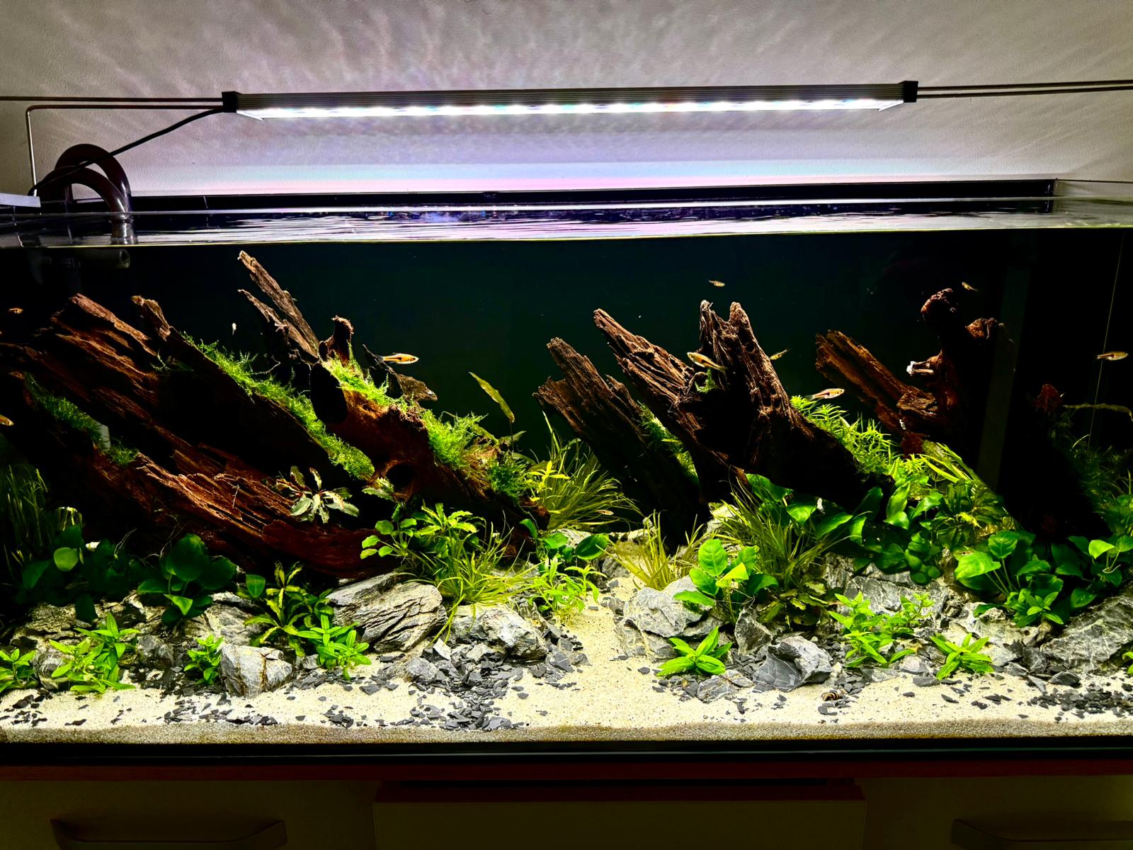 Inspirat din pădurile inundate și cursurile de apă sălbatică, acest acvariu a fost gândit ca un peisaj subacvatic matur, stabil și coerent.