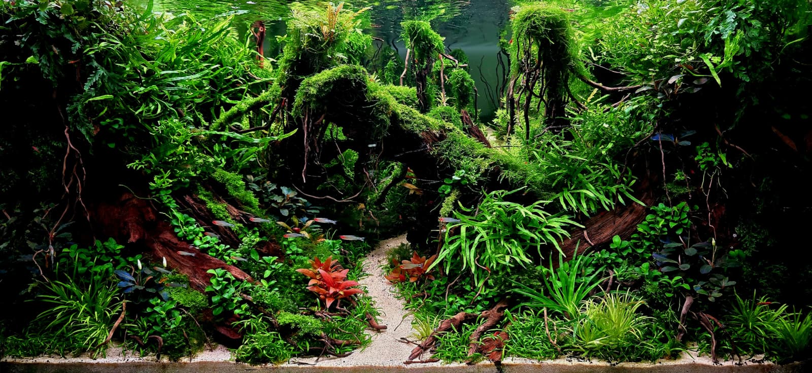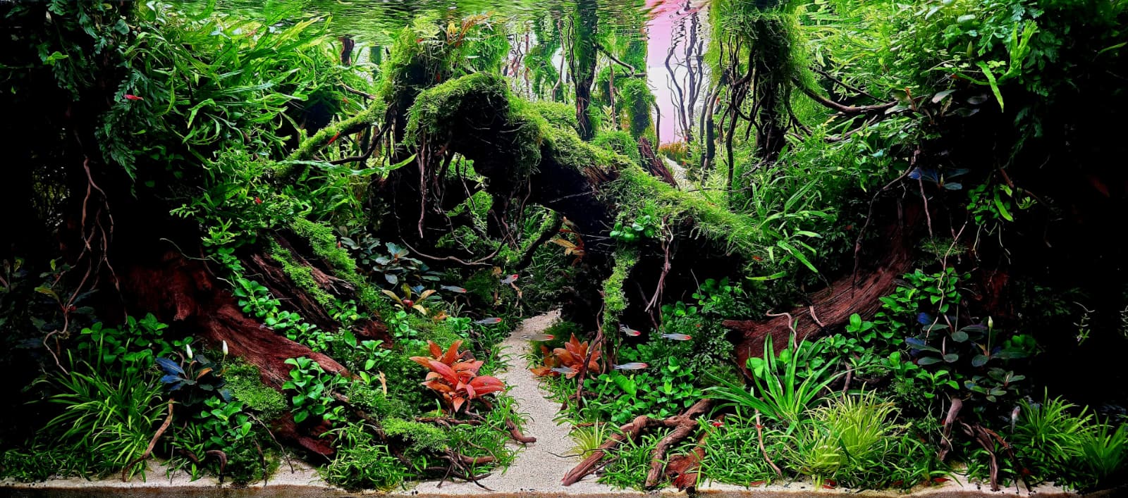 Inspirat de liniștea unei păduri tropicale scufundate, acest acvariu recreează un peisaj natural în care rădăcinile masive par să se împletească într-un dans tăcut al timpului.